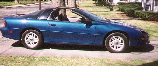 It is a 1994 Camaro Z28 and it is Quasar Blue (the factories name for the color). I purchased this car three years ago from a dealer just over the MA border. It came to me with just over 80K miles, A4, T-Tops, Cassette player, Power everything, Cruise Control, Dual Air bags, 4 wheel disk brakes with ABS, and a Flowmaster exhaust. As soon as I picked up the car I knew it wasn't going to stay 'stock' for long. |